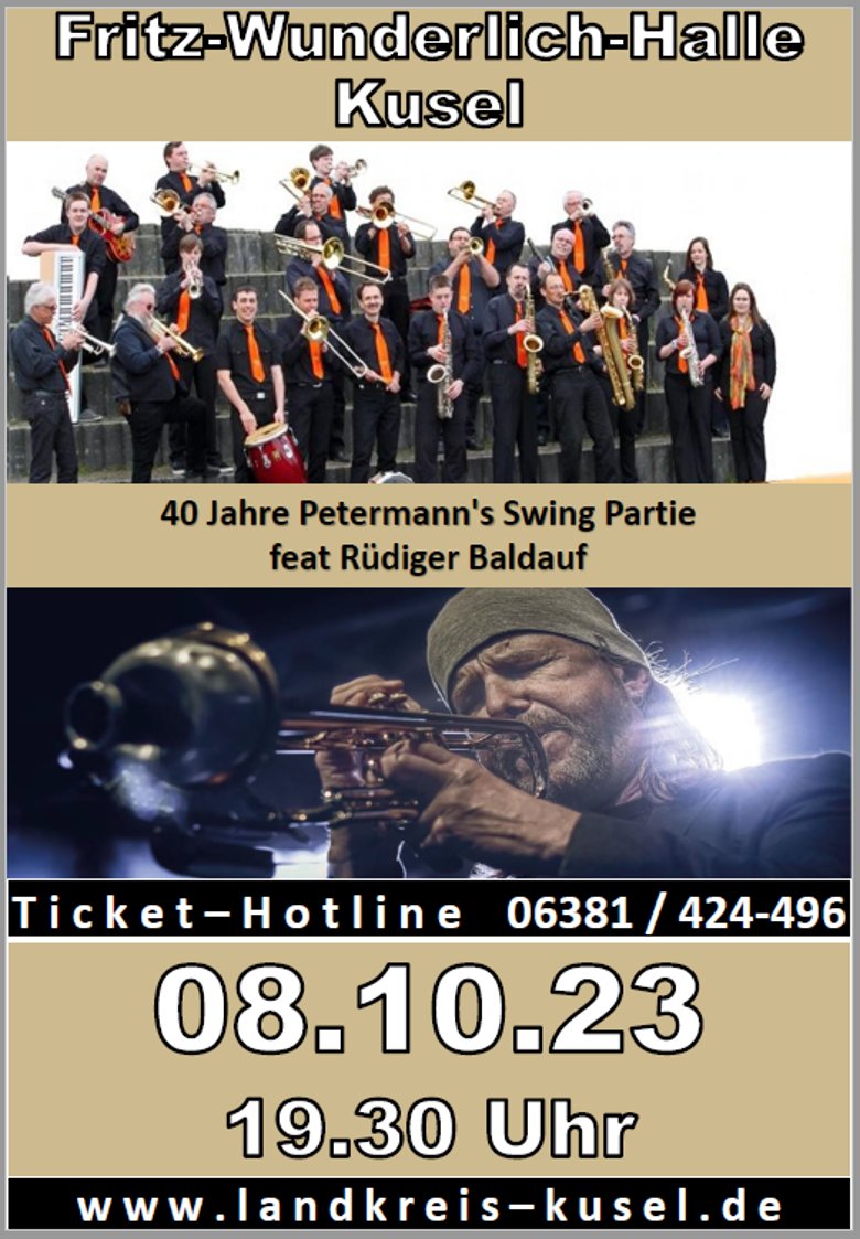 Die Petermann’s Swing-Partie unter der Leitung von Klaus Petermann ist DIE Big Band in klassischer Besetzung in der Westpfalz. Die Band besteht seit nunmehr 40 Jahren und ist aus der regionalen Musikszene nicht mehr wegzudenken. Das Jubiläum wird am 08.10.2023 zusammen mit dem renommierten Kölner Trompeter Rüdiger Baldauf gefeiert. Eine bedeutende Stellung in der Band hat Klaus Petermann. Er leitet die Big Band seit der Gründung im Jahr 1983 und formt sie mit großem Engagement zu einem homogenen Klangkörper.