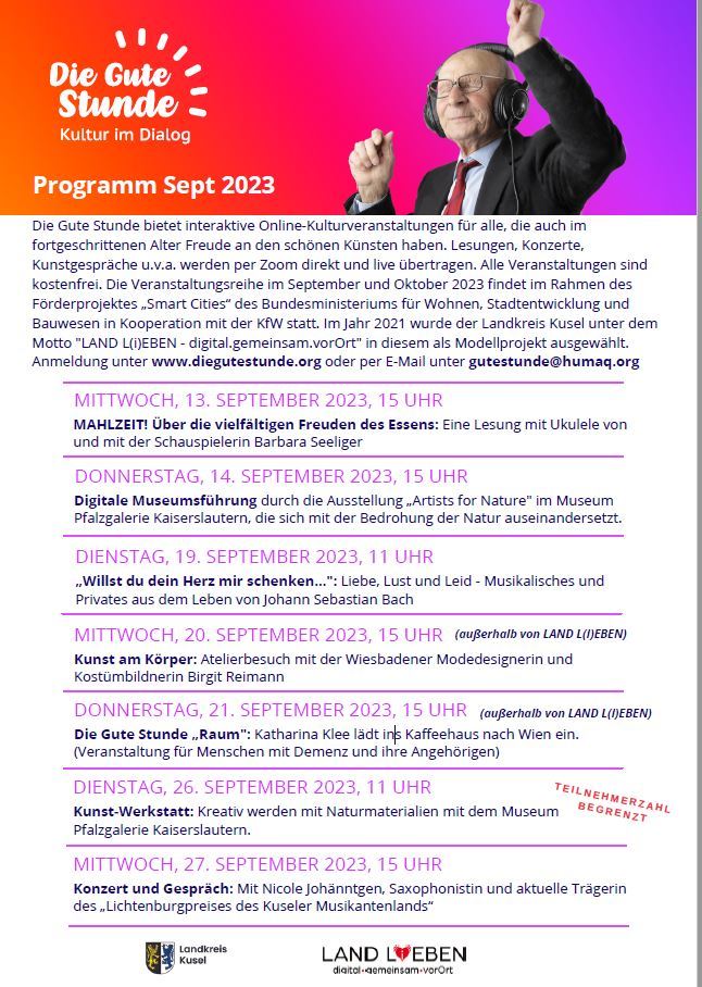 Ab dem 13. September 2023 veranstaltet die gemeinnützige Initiative „Die Gute Stunde“ zehn Online-Kulturveranstaltungen für ältere Menschen im Landkreis Kusel und darüber hinaus. Die zweimonatige Veranstaltungsreihe findet im Rahmen von "LAND L(i)EBEN – digital.gemeinsam.vorOrt“, dem „Smart City“ Modellprojekt des Landkreises Kusel statt.