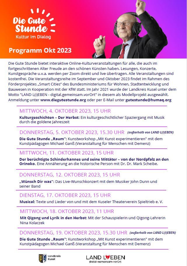 Ab dem 13. September 2023 veranstaltet die gemeinnützige Initiative „Die Gute Stunde“ zehn Online-Kulturveranstaltungen für ältere Menschen im Landkreis Kusel und darüber hinaus. Die zweimonatige Veranstaltungsreihe findet im Rahmen von "LAND L(i)EBEN – digital.gemeinsam.vorOrt“, dem „Smart City“ Modellprojekt des Landkreises Kusel statt.