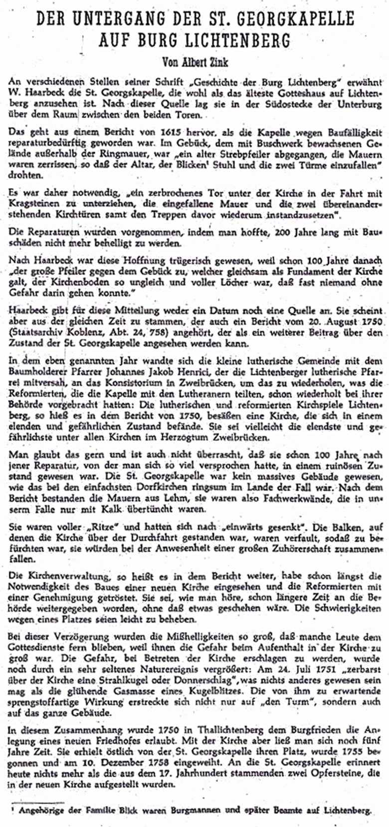 "Der Untergang der St. Georgkapelle auf Burg Lichtenberg" von Albert Zink, Heimatkalender Birkenfeld, 1961