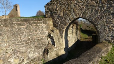 Mit ihren beiden Glockentürmchen war die Kapelle aus südlicher Richtung gut zu erkennen, da sie sicher die äußere Ringmauer erhob. Etwa acht Meter hohe Strebepfeiler sollten zum Abhang hin für Stabilität sorgen. Der Innenraum war über zwei Treppen erreichbar. Erhalten geblieben sind die beiden Giebelseiten sowie die darunterliegenden Torbögen.