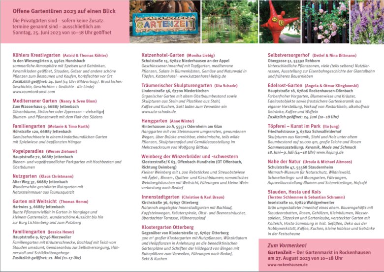 Die Privatgärten sind – sofern keine Zusatztermine genannt sind – ausschließlich am Sonntag, 25. Juni 2023 von 10–18 Uhr geöffnet.
