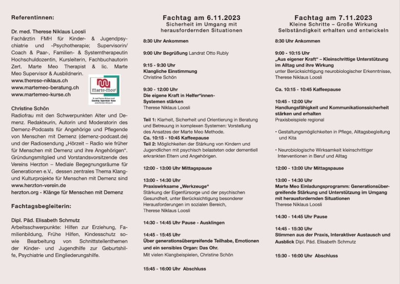 Die Referentin, Therese Niklaus Loosli, zeigt alltagsnah anhand anschaulicher Videobeispiele, wie zwischenmenschliche Herausforderungen im Alltag mit Menschen mit Demenz, ADHS, Autismus, psychischen Erkrankungen wirksam mit einfachen Mitteln begegnet werden kann.