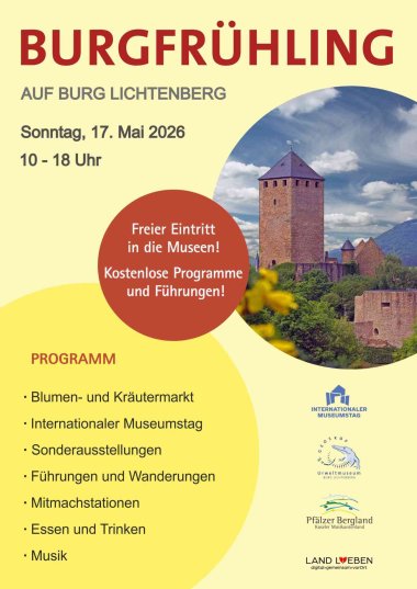 Zum zehnten Mal lädt die Burg Lichtenberg bei Kusel wieder zum „Burgfrühling“ ein. Am Sonntag, den 17. Mai, erwartet die Besucherinnen und Besucher auf der größten Burg der Pfalz ein abwechslungsreiches und buntes Programm mit Blumen- und Kräutermarkt, Sonderausstellungen im Urweltmuseum GEOSKOP und in der Zehntscheune, Mitmachstationen für Kinder, verschiedenen Musikdarbietungen, Wanderungen und Führungen sowie einem reichhaltigen kulinarischen Angebot.