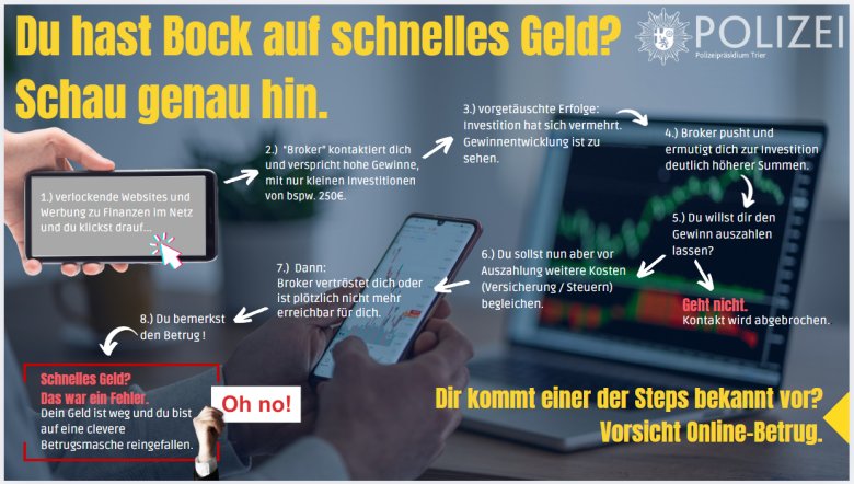 Sind Sie unsicher, ob ein Angebot seriös ist oder nicht oder haben Sie den Verdacht, auf die Betrugsmasche hereingefallen zu sein, finden Sie weitere Informationen zum Thema „Cyber-Trading-Fraud“ auf der Internet-Seite der Polizei Rheinland-Pfalz (Kriminaldirektion Trier): https://www.polizei.rlp.de/die-polizei/dienststellen/polizeipraesidium-trier/unsere-dienststellen/kriminaldirektion-trier/cyber-trading-fraud