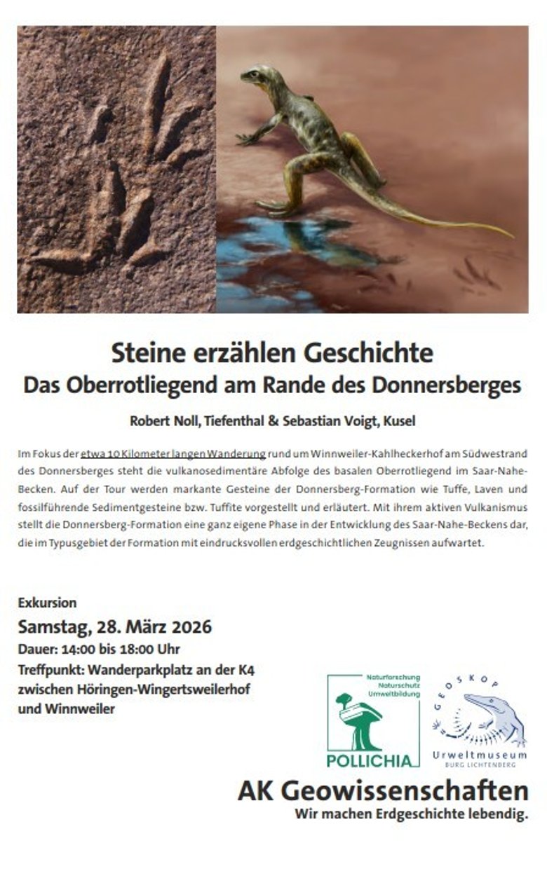 Das Arbeitskreis Geowissenschaften der POLLICHIA lädt ganz herzlich zu einer Exkursion ein - am Samstag, den 28. März 2026, von 14 bis 18 Uhr, zum Thema „Steine erzählen Geschichte – das Oberrotliegend am Rande des Donnersberges“.