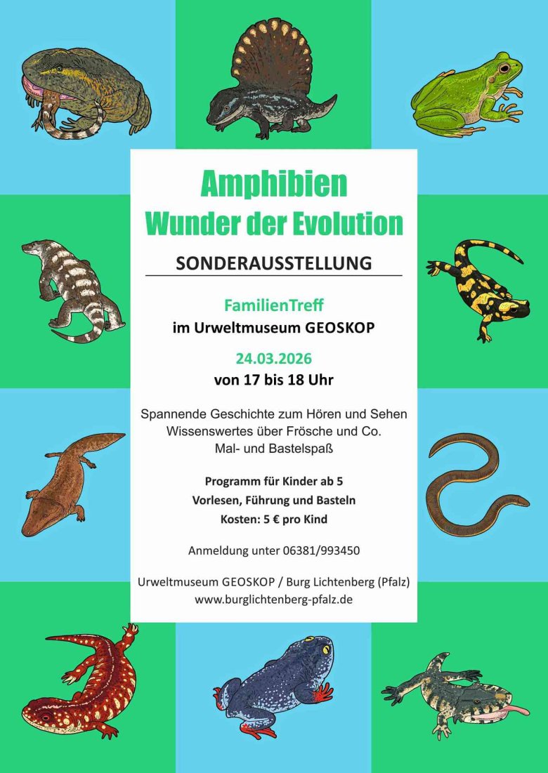 Das erwartet euch beim Familientreff in der Sonderausstellung "Amphibien - Wunder der Evolution" am Sonntag, 24. März im Urweltmuseum GEOSKOP