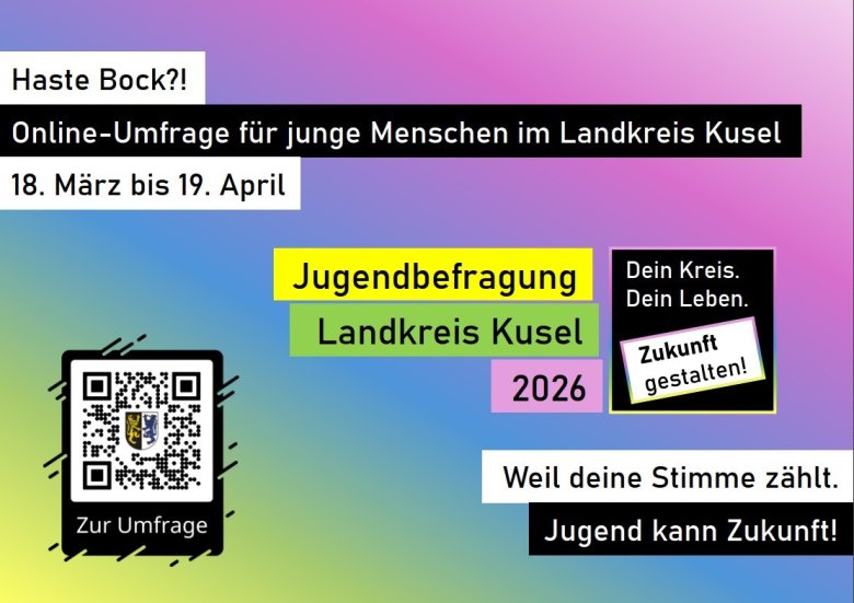Der Landkreis Kusel startet eine Online-Umfrage, um die Perspektiven, Wünsche und Bedürfnisse junger Menschen im Kreisgebiet genauer zu erfassen. Ziel der Umfrage ist es, wichtige Impulse für die zukünftige Gestaltung von Angeboten, Beteiligungsmöglichkeiten und Lebensbedingungen von jungen Menschen im Landkreis Kusel zu gewinnen.