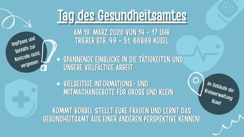 Am diesjährigen Tag des Gesundheitsamtes - am Donnerstag, den 19. März 2026 - lädt das Gesundheitsamt der Kreisverwaltung Kusel zu einem Tag der offenen Tür ein. Von 14 bis 17 Uhr haben Interessierte die Möglichkeit, das Gesundheitsamt kennenzulernen, einen Blick hinter die Kulissen zu werfen und sich umfassend über verschiedene Gesundheitsthemen zu informieren.