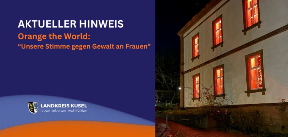 Die Kreisverwaltung Kusel wird vom 25.11.2025 bis zum 10.12.2025 (Tag der Menschenrechte) in der Farbe „orange“ erstrahlen, um so die Öffentlichkeit für dieses Thema zu sensibilisieren. Die Farbe Orange wird symbolisch als alarmierende Farbe genutzt, die auf die gesellschaftlichen Zustände aufmerksam macht und in eine Zukunft ohne Gewalt weisen soll.
