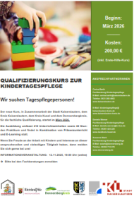 Kindertagespflege stellt als familiennahe sowie flexible Betreuungsform ein ergänzendes Angebot zur Tagesbetreuung von Kindern in Einrichtungen dar, so dass Eltern die Vereinbarkeit von Familie und Beruf erleichtert wird und Kinder von einer intensiven Betreuung profitieren. Der Kurs bietet den optimalen Einstieg in die Tätigkeit als Kindertagespflegeperson.